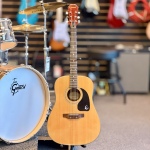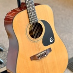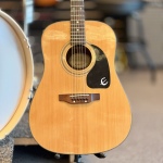 This Epiphone PR-200 dreadnought acoustic guitar in a beautiful Natural gloss finish. This is from the "Epiphone by Gibson" era, known for being sturdy, reliable, and having a much thinner, more comfortable neck than many modern budget acoustics.